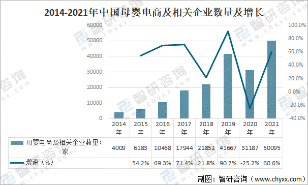 2014-2021年中國母嬰電商及相關企業數量及增長
