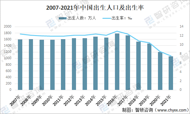 2007-2021年中國出生人口及出生率