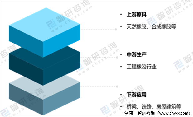 工程橡膠制品的上游原材料主要是天然橡膠、合成橡膠等,其中合成橡膠產(chǎn)量更大,應(yīng)用面更廣;下游主要應(yīng)用于橋梁、鐵路、房屋建筑等工程領(lǐng)域,具體產(chǎn)品如橋梁橡膠支座、建筑減震支座、橋梁伸縮縫密封條、橡膠止水帶、鐵軌枕墊等。