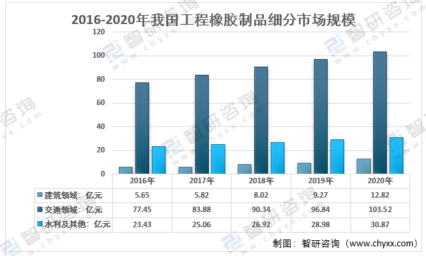2020年我國工程橡膠行業(yè)市場(chǎng)規(guī)模147.21億元,其中,建筑領(lǐng)域12.82億元;交通領(lǐng)域103.52億元;水利及其他30.87億元。