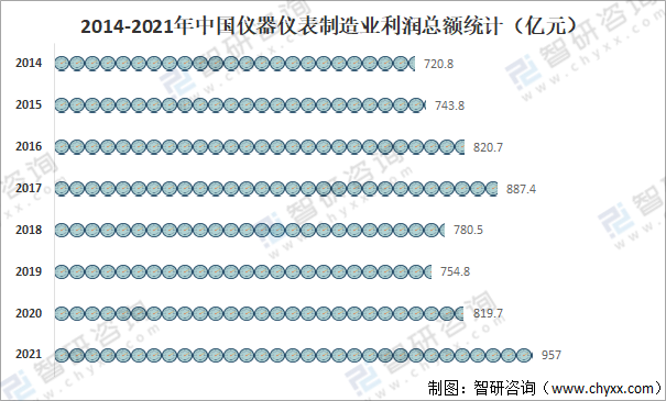 隨著中國儀器儀表制造業營業收入的增加,利潤總額也隨之增長,2021年中國儀器儀表制造業利潤總額達957億元,較2020年增加了137.3億元,同比增長16.75%。