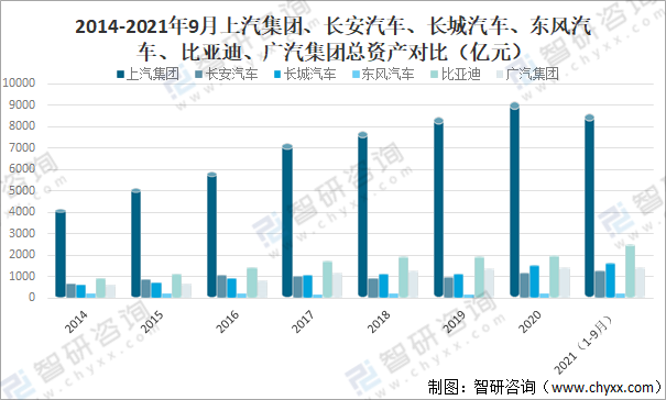 2014-2021年9月上汽集團、長安汽車、長城汽車、東風汽車、比亞迪、廣汽集團總資產對比(億元)