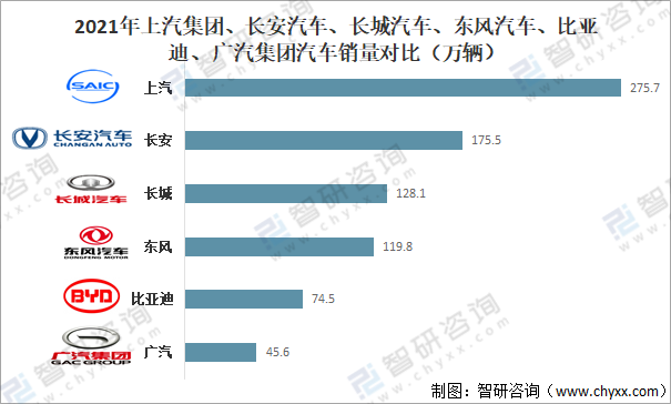 從汽車銷量來看,2021年上汽汽車銷量完成275.7萬輛,長安汽車銷量完成175.5萬輛,長城汽車銷量完成128.1萬輛,東風汽車銷量完成119.8萬輛,比亞迪汽車銷量完成74.5萬輛,廣汽汽車銷量完成45.6萬輛。