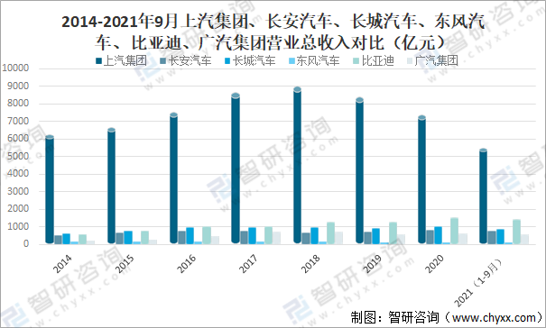 2014-2021年9月上汽集團、長安汽車、長城汽車、東風汽車、比亞迪、廣汽集團營業總收入對比(億元)