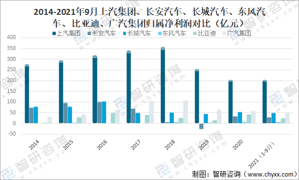 2014-2021年9月上汽集團、長安汽車、長城汽車、東風汽車、比亞迪、廣汽集團歸屬凈利潤對比(億元)