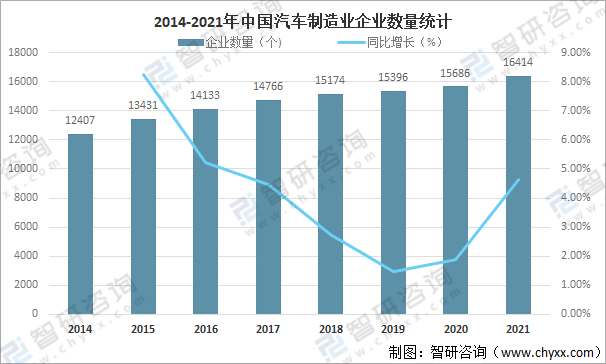 隨著中國經濟持續較快發展、居民消費能力提高、汽車關稅降低、產業政策扶持等,近年來我國汽車產業的不斷發展壯大,對經濟和社會的發展做出了重要貢獻,2021年中國汽車制造業企業共計16414個,較2020年增加了728個,同比增長4.64%。