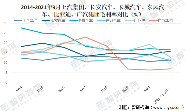 2014-2021年9月上汽集團、長安汽車、長城汽車、東風汽車、比亞迪、廣汽集團毛利率對比(%)