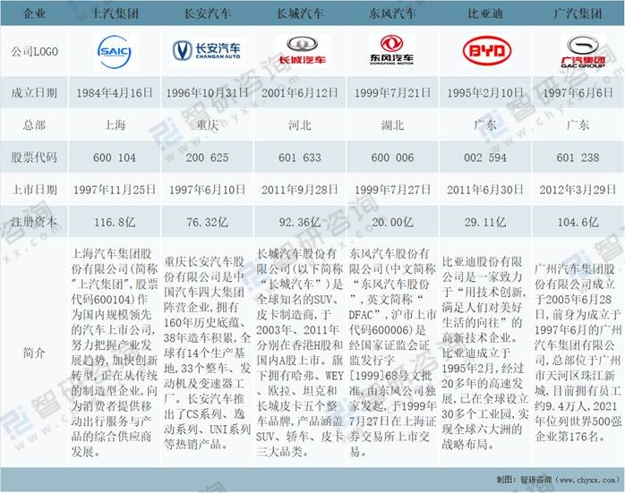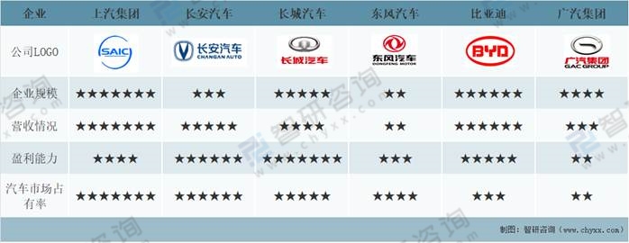 上汽集團、長安汽車、長城汽車、東風汽車、比亞迪、廣汽集團基本情況對比