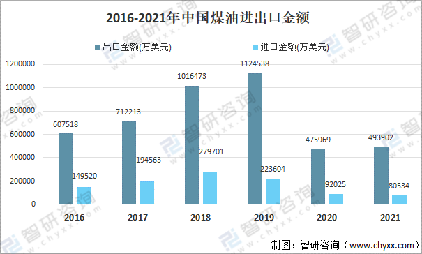 我國煤油出口多于進口,其中2021年中國煤油出口金額為493902萬美元,同比增長3.8%;中國煤油進口金額為80534萬美元,同比下降12.5%。