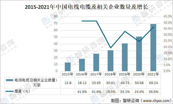 電線電纜行業作為國民經濟中最大的配套行業之一,在我國機械工業的細分行業中位居第二,僅次于汽車整車制造和零部件及配件制造業,是各產業的基礎。中國電線電纜及相關企業數量快速增長,截止2021年底,中國電線電纜及相關企業數量達到69.24萬家,同比增和36.6%。