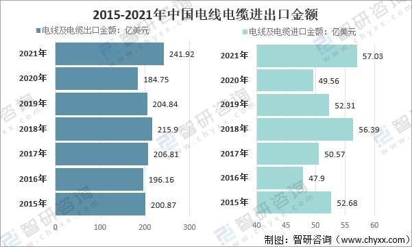 2015-2021年中國電線電纜進出口金額