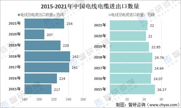 中國不但電線電纜行業產量銷售量大,而且電線電纜出口數量較多,基本維持在200萬噸以上,其中2020年中國電線電纜進口數量為21萬噸,同比下降8.1%;電線電纜出口數量為207萬噸,同比下降9.6%。2021年中國電線電纜進口數量為22萬噸,同比增長4.8%;電線電纜出口數量為234萬噸,同比增長13.0%。