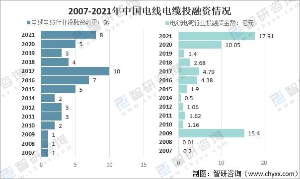 2007-2021年中國電線電纜投融資情況