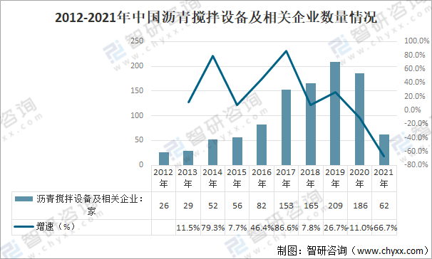2012-2021年中國瀝青攪拌設備及相關企業數量情況
