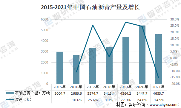 2015-2021年中國石油瀝青產量及增長