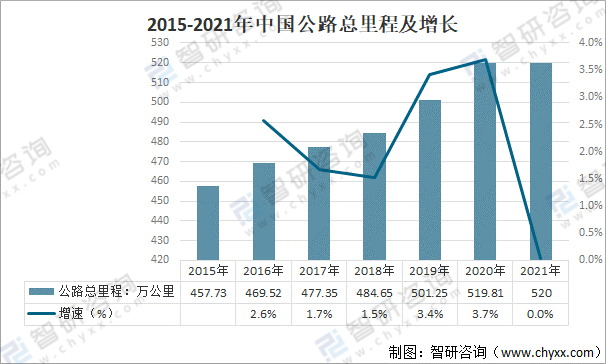 根據交通運輸部發布的數據,截止2020年底,全國公路通車總里程為519.81萬公里,比上年增加18.56萬公里;2021年中國公路總里程預計520萬公里,基本與2020年持平。