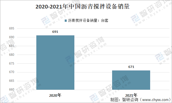 隨著我國公路通車里程尤其是高速公路通車里程的快速延伸,造就了瀝青混合料攪拌設備的全球最大市場。2021年中國瀝青攪拌設備銷量671臺套,較2020年減少20臺套,同比下降2.89%。