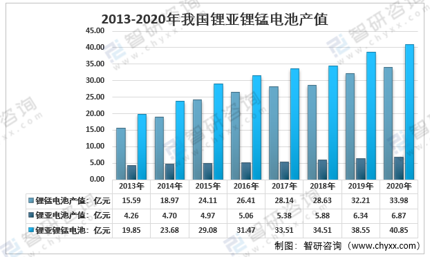 近年來,在技術發展和需求增長的刺激下,我國鋰亞鋰錳電池行業產值呈現不斷上升的趨勢。根據智研咨詢發布的《2022-2028年中國鋰亞鋰錳電池行業市場競爭態勢及投資方向分析報告》顯示,2020年我國鋰亞鋰錳電池產值為40.85億元;其中鋰錳電池產值為33.98億元;鋰亞電池產值為6.87億元。