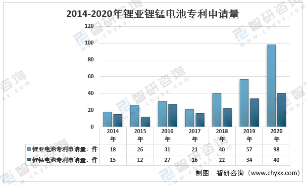 在產值和需求量都在不斷增長的同時,鋰亞鋰錳電池行業的技術也進步飛快。2020年,我國鋰亞電池相關專利申請量達到98件,鋰錳電池相關專利申請量達到40件,且近幾年來兩者專利量都在不斷增加,說明我國鋰亞鋰錳電池企業和相關機構對產業技術研發較為重視,不斷優化產品性能。