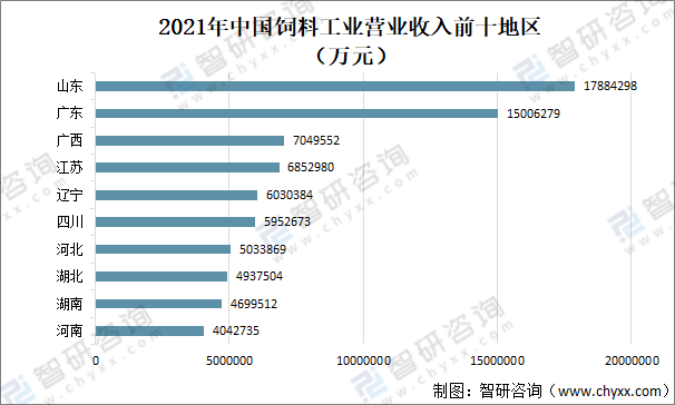 2021年中國飼料工業(yè)營業(yè)收入前十地區(qū)