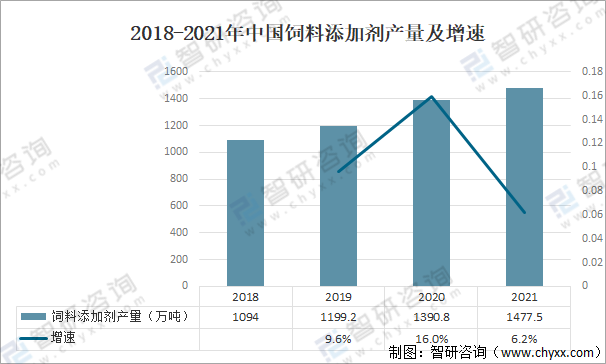 2018-2021年中國飼料添加劑產(chǎn)量及增速