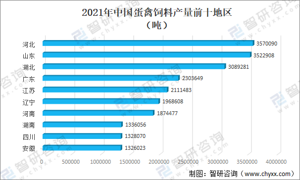 2021年中國蛋禽飼料產(chǎn)量前十地區(qū)
