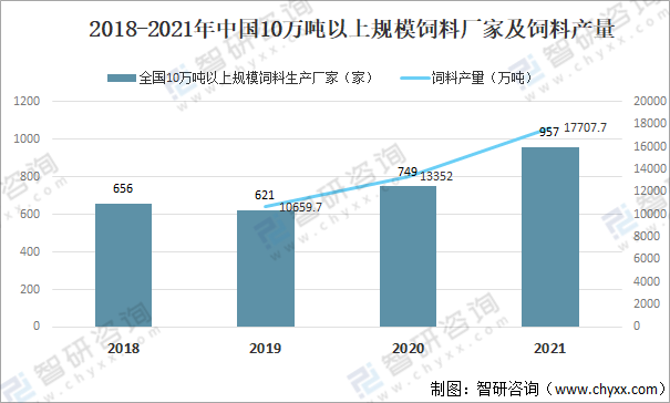 2018-2021年中國10萬噸以上規(guī)模飼料廠家及飼料產(chǎn)量