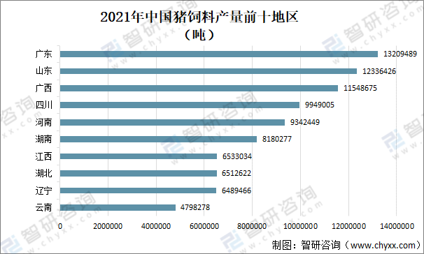 其中2021年中國豬飼料產(chǎn)量最多地區(qū)為廣東13209489噸;其次是山東地區(qū)豬飼料產(chǎn)量12336426噸;再次是廣西地區(qū)豬飼料產(chǎn)量為11548675噸。