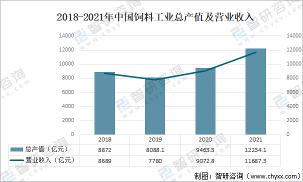 2018-2021年中國飼料工業(yè)總產(chǎn)值及營業(yè)收入