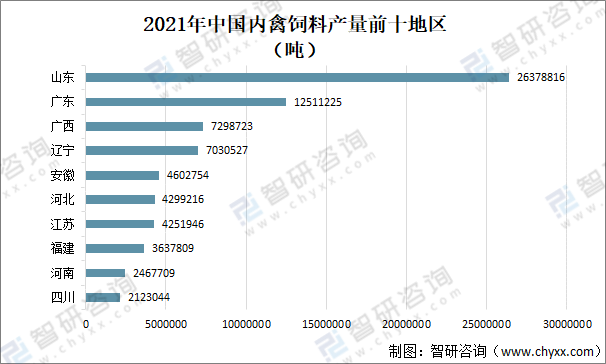 2021年中國內(nèi)禽飼料產(chǎn)量前十地區(qū)