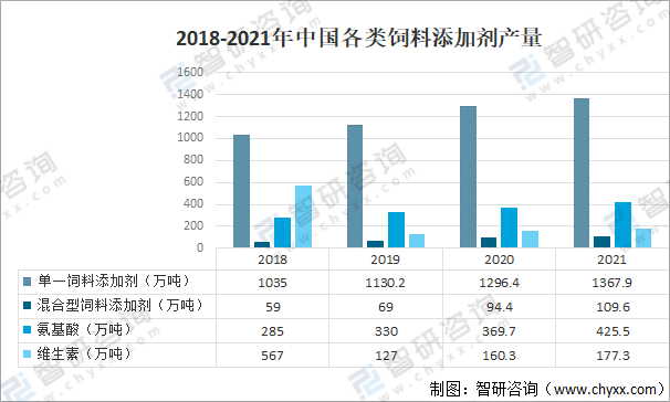 2018-2021年中國各類飼料添加劑產(chǎn)量