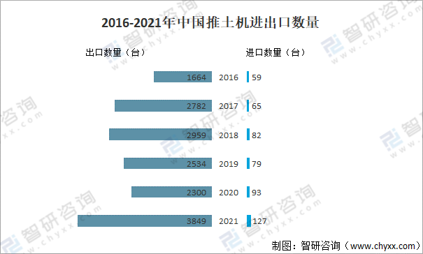 我國(guó)推土機(jī)出口數(shù)量較多,2021年中國(guó)推土機(jī)出口數(shù)量為3849臺(tái),同比增長(zhǎng)67.3%;進(jìn)口數(shù)量為127臺(tái),同比增長(zhǎng)36.6%。