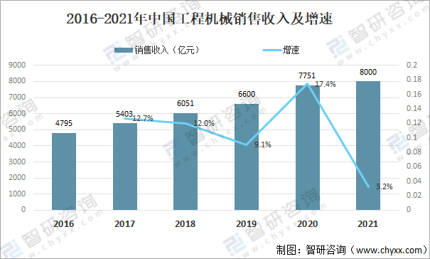 2016-2021年中國(guó)工程機(jī)械銷售收入及增速