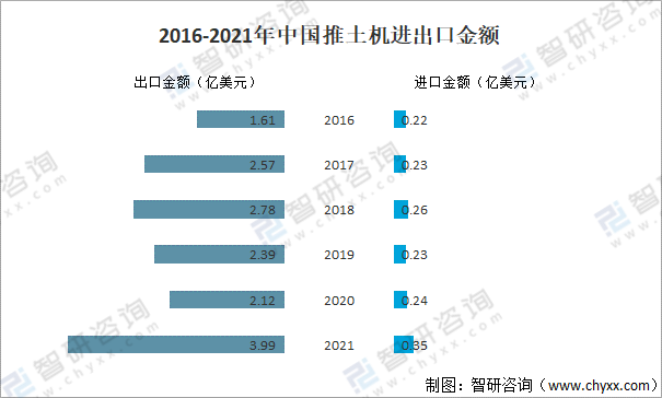2016-2021年中國(guó)推土機(jī)進(jìn)出口金額
