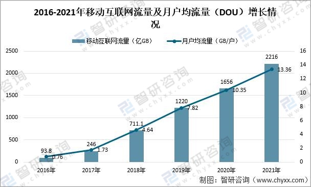 2016-2021年移動(dòng)互聯(lián)網(wǎng)流量及月戶(hù)均流量(DOU)增長(zhǎng)情況