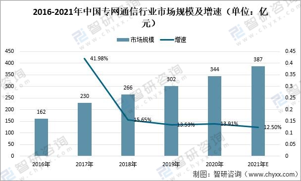 2016-2021年中國(guó)專(zhuān)網(wǎng)通信行業(yè)市場(chǎng)規(guī)模及增速(單位:億元)