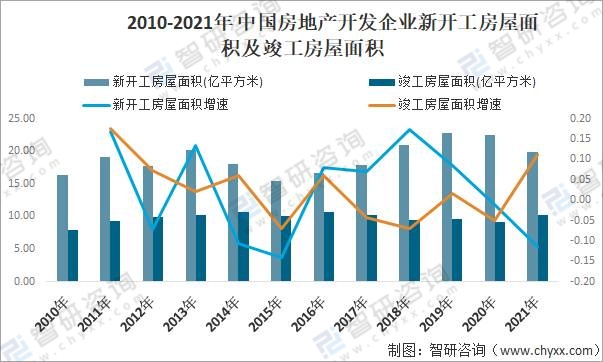 2010-2021年中國房地產開發企業新開工房屋面積及竣工房屋面積