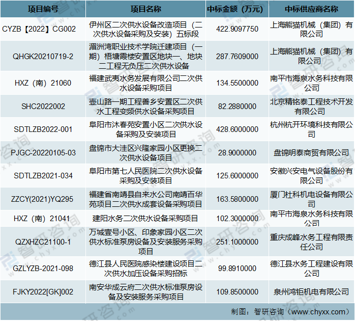 2022年中國二次供水行業部分公開招標中標情況(截止2022年2月18日)
