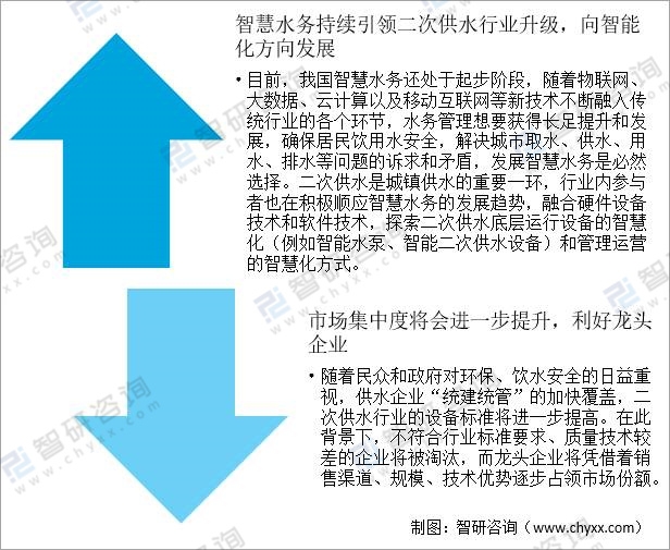 在全力推動智慧城市建設的大背景下,智慧水務建設是不可缺少的一環,而二次供水為供水重要的環節,也必將順應智慧水務的發展趨勢,全面朝著智能化方面發展;另一方面,在 “統建統管”政策的監管下,行業龍頭企業發展優勢凸顯,將逐步占領市場份額。
