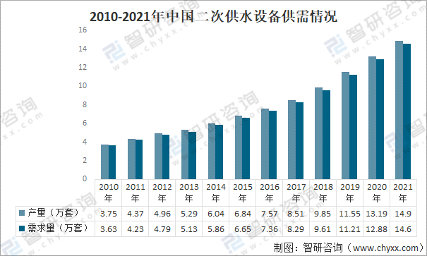 我國高層建筑在上世紀70年代逐漸出現,隨著城鎮化持續推進,高層建筑的數量和居住密度逐步提高,原有的供水壓不能滿足供水需求,二次供水方式應運而生。近年我國二次供水設備產需量穩步增長,2021年中國二次供水設備產量約為14.9萬套,需求量約為14.6萬套。