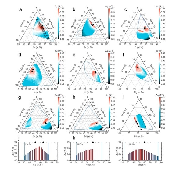 研究團隊及其合作者分析了5700余種合金的X射線衍射(XRD)圖譜及其與非晶形成能力之間的關系,發現合金的非晶形成能力與XRD第一峰的峰寬(Δq)有明顯關聯。利用Δq-GFA判據,研究團隊在Zr-Cu-Cr和Ir-Co-Ta合金體系中發現了非晶合金新材料,驗證了這一判據的正確性。在此基礎上,研究團隊進一步探索了Δq-GFA判據的理論機制,發現寬Δq所反映的合金結構整體無序度與幾種特定團簇的出現情況有關,團簇構型種類越多,越有利于在非晶結構中實現接近晶體的密堆度。由于每種團簇的原子間距不同,其結果即是Δq所反映的不同。