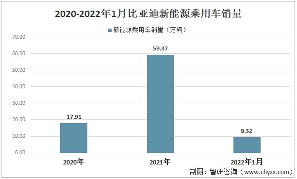 比亞迪為國內新能源汽車龍頭企業,根據數據:2021年比亞迪新能源乘用車銷量為59.37萬輛(純電動車銷售320810輛,插電式混動車型銷售272935輛),同比增長231.6%,新能源車輛的銷量已經占比亞迪乘用車總銷量的81%。2022年1月銷量為9.32萬輛,同比增長361.7%。
