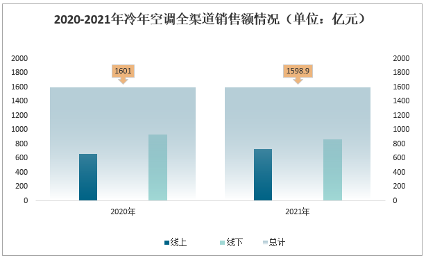 從近兩年中國冷年空調(diào)全渠道銷售額情況來看,隨著經(jīng)濟(jì)水平的發(fā)展,人們的生活水平越來越高,所以空調(diào)銷售也越來越好,2020年中國冷年空調(diào)全渠道銷售額1601億元,其中:冷年空調(diào)線上銷售額662億元,冷年空調(diào)線下銷售額939億元;2021冷年在上新方面有著“獨(dú)特”的節(jié)奏,而整體市場表現(xiàn)方面乏善可陳,2021年中國冷年空調(diào)全渠道銷售額1598.9億元,其中:冷年空調(diào)線上銷售額730.7億元,同比增長10.4%,冷年空調(diào)線下銷售額868.2億元,同比下降7.50%。