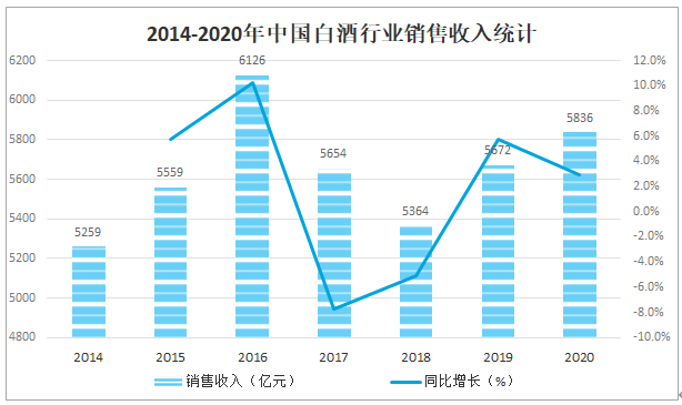 白酒在我國(guó)可謂源遠(yuǎn)流長(zhǎng),釀酒歷史已延續(xù)了幾千年,中國(guó)人千百年流傳下來(lái)的習(xí)俗就是逢年過(guò)節(jié)、親朋相聚、婚喪嫁娶、慶功祝壽,只要是飯桌上,酒便是必不可少的“飯桌”一詞也逐漸演變?yōu)榱?ldquo;酒桌”,而酒桌文化也成為中國(guó)特殊的一種文化。白酒在國(guó)民經(jīng)濟(jì)中占有重要地位,2020年中國(guó)白酒行業(yè)銷售收入達(dá)5836億元,較2019年增加了164億元,同比增長(zhǎng)2.9%。
