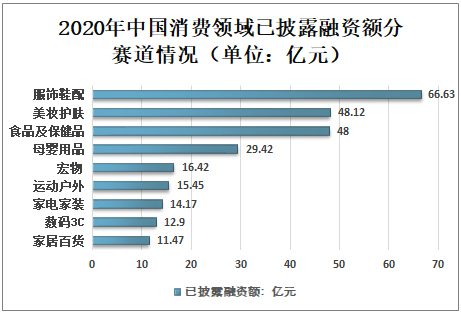 服裝鞋帽是人民生活必需品,是永久消費性商品,是消費品工業的重要組成部分。從2021年年中國消費領域已披露融資額分布來看,服飾鞋配已披露融資額66.63億元,在消費領域融資第一賽道;美妝護膚、食品及保健品是近三年來消費領域融資事件連續提升的第二賽道,已披露融資額分別為48.12億元、48億元,第三賽道是母嬰用品,已披露融資額是29.42億元。