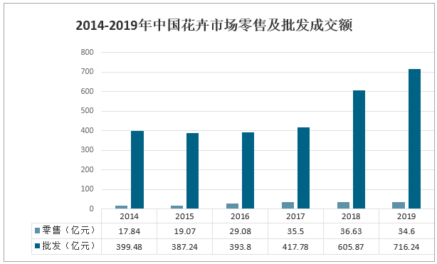 2019年中國花卉零售市場成交額為34.6億元,同比下降5.5%;中國花卉批發市場成交額為716.24億元,同比增長18.2%。