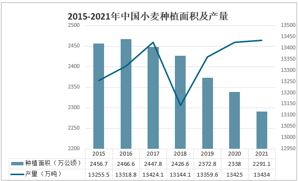 小麥是三大谷物之一,幾乎全作食用,僅約有六分之一作為飼料使用。兩河流域是世界上最早栽培小麥的地區(qū),中國是世界較早種植小麥的國家之一。 全國夏糧播種面積26438千公頃,比2021年增加265.5千公頃,增長1.0%。其中小麥播種面積2291.1萬公頃,增長0.9%;小麥產(chǎn)量13434萬噸,同比增長2.0%。2015-2021年中國小麥種植面積及產(chǎn)量