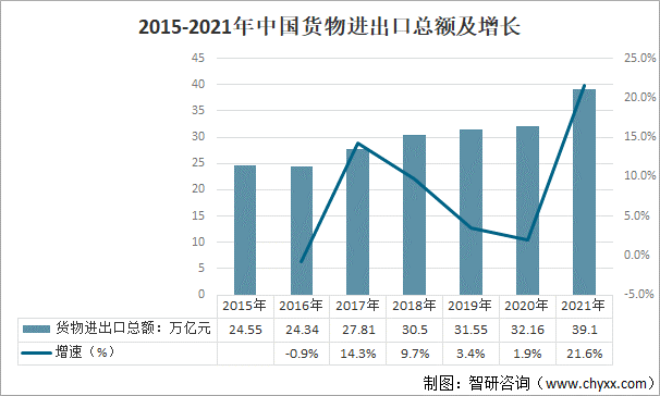 2015-2021年中國貨物進出口總額及增長