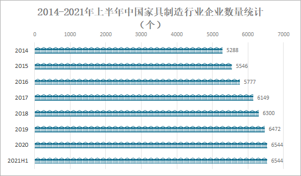 隨著經濟的高速發展和人民生活水平的不斷提高,家具作為生活起居的重要載體,已不僅限于消費者的物質需求,更寄托了人們的精神追求。近年來中國家具行業發展迅速,2020年中國家具制造行業企業數量達6544個,較2019年增加了72.00個,同比增長1.1%,2021年中國家具制造行業企業數量為6544個,與2020年年底持平。2014-2021年上半年中國家具制造行業企業數量統計