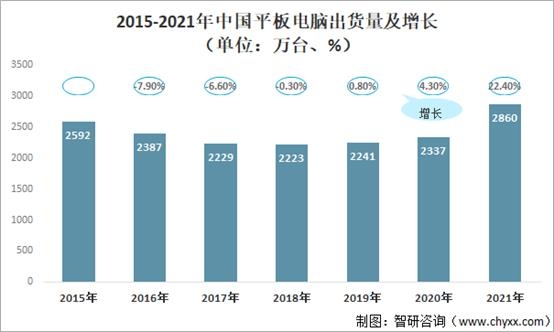 隨著國(guó)民經(jīng)濟(jì)的發(fā)展,網(wǎng)絡(luò)傳輸速度的升級(jí),攜帶方便的電子產(chǎn)品已逐漸成為人們連接世界的橋梁,就辦公性能而言,筆記本電腦相對(duì)于手機(jī)、平板的優(yōu)勢(shì)則更加明顯.筆記本電腦已得到了廣泛的應(yīng)用。新冠疫情期間,在線教育迅速普及,人們對(duì)于將平板電腦作為教育工具的接受度逐漸提高,一定程度上帶動(dòng)了中國(guó)對(duì)平板電腦需求的增長(zhǎng)。2020年中國(guó)平板電腦出貨量2337萬(wàn)臺(tái),同比增長(zhǎng)4.3%;2021年,中國(guó)平板電腦出貨量2860萬(wàn)臺(tái),同比增長(zhǎng)22.4%,平板電腦出貨量為2015年以來(lái)最高值,占全球平板電腦出貨量的16%。